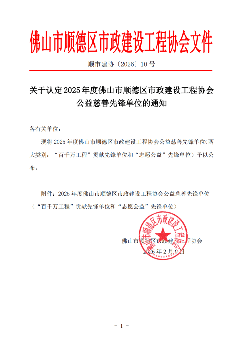 顺市建协〔2026〕10号 关于认定2025年度佛山市顺德区市政建设工程协会公益慈善先锋单位的通知.pdf