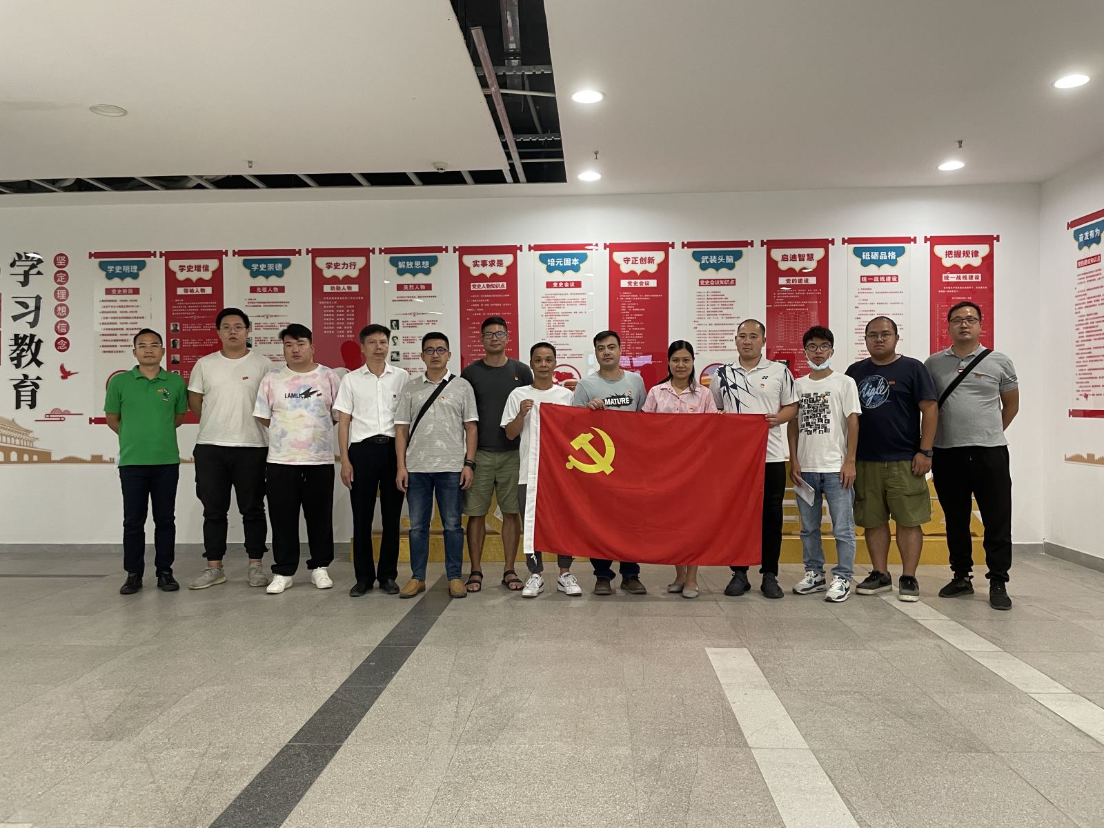 党员同志在党史学习墙前学习