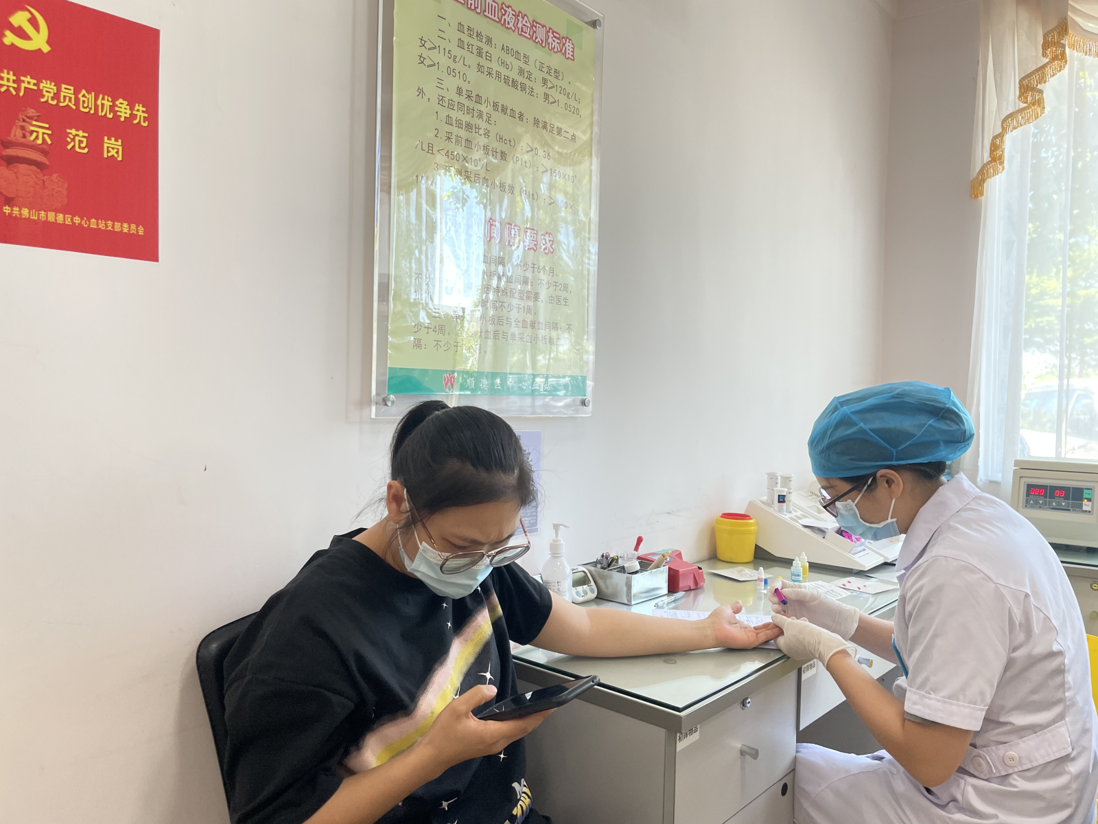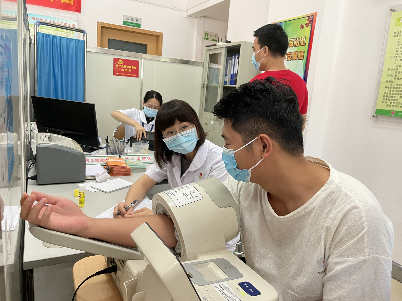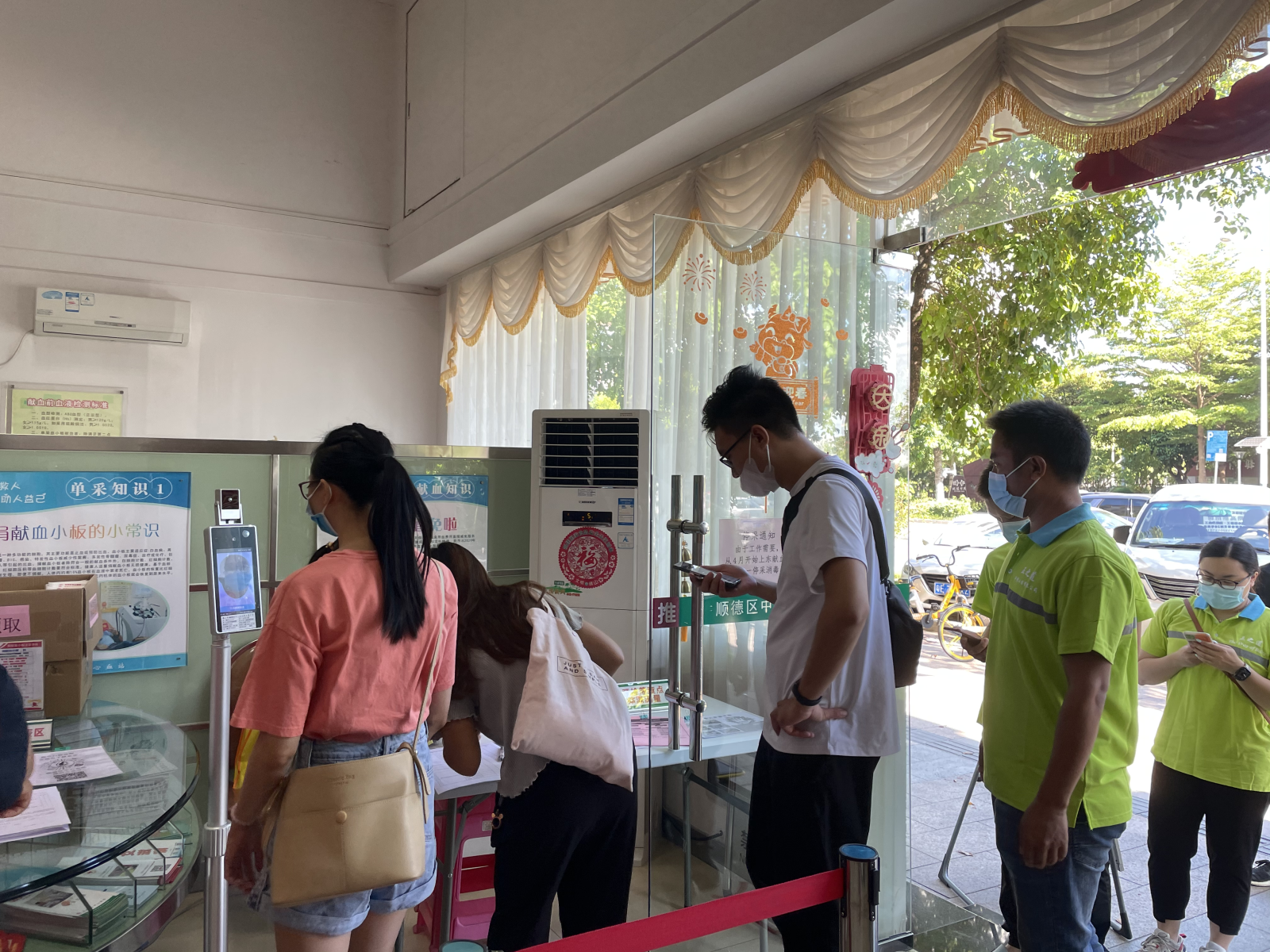 在大良上东区献血点现场,参与献血的企业党员、职工按照血站工作人员和志愿者的指引,测体温、亮绿码,有条不紊地进行献血前的一系列登记填表、测量血压、血液初筛等检查流程。