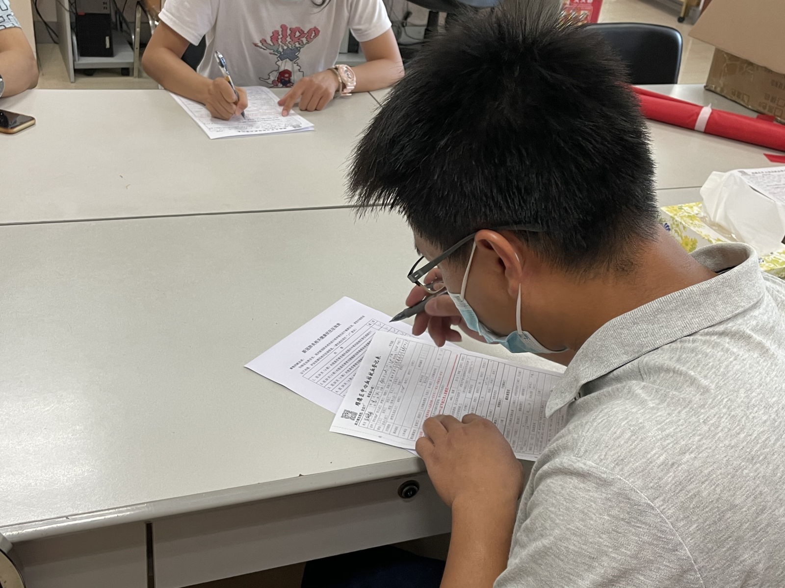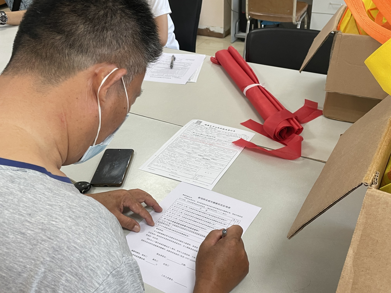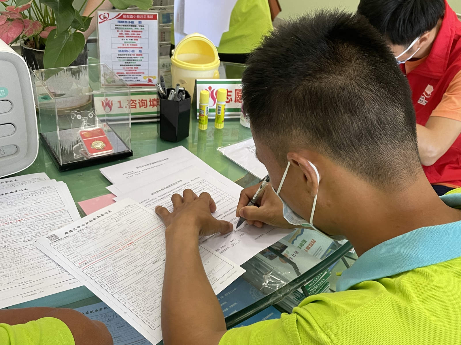在大良上东区献血点现场,参与献血的企业党员、职工按照血站工作人员和志愿者的指引,测体温、亮绿码,有条不紊地进行献血前的一系列登记填表、测量血压、血液初筛等检查流程。